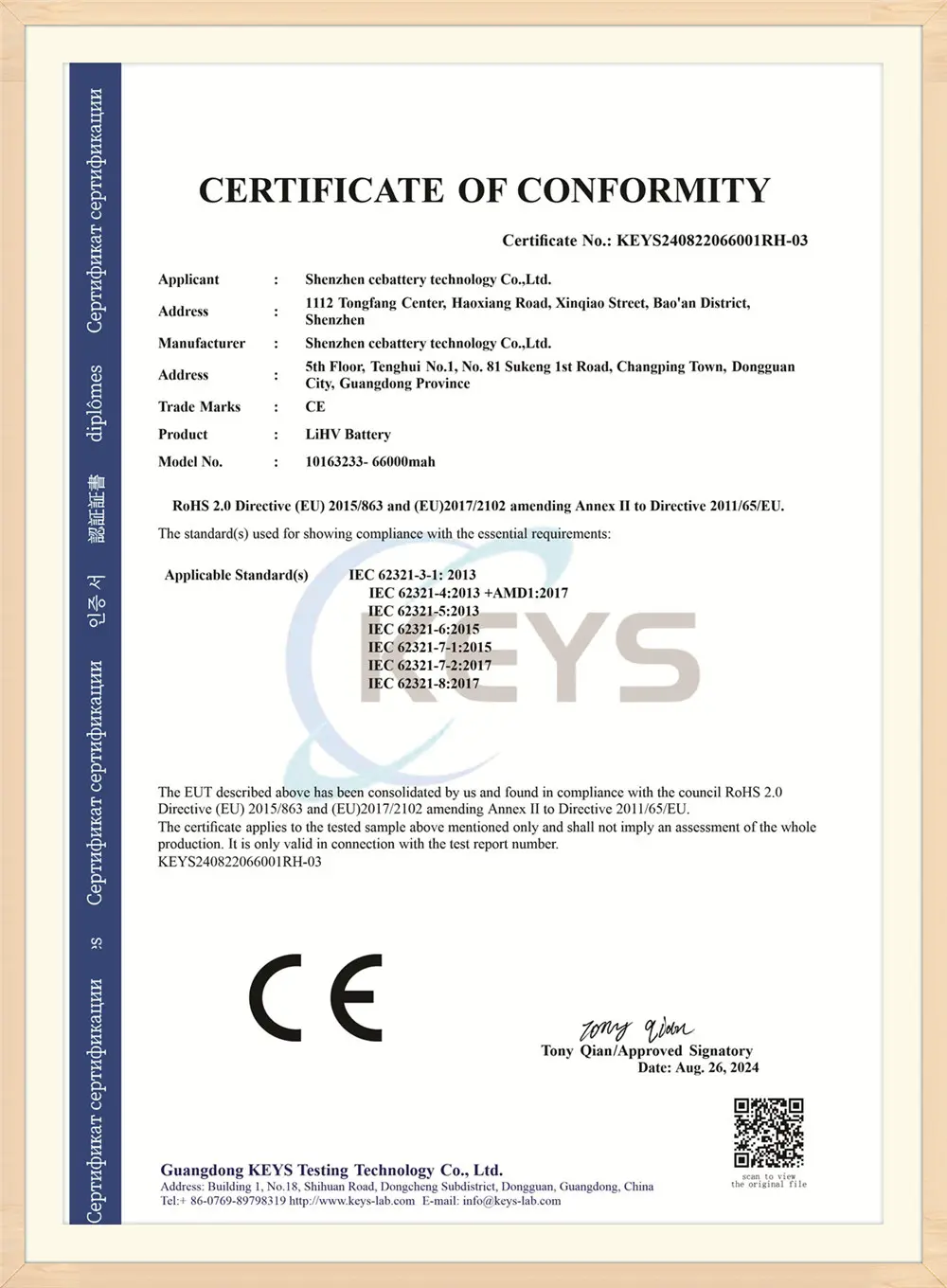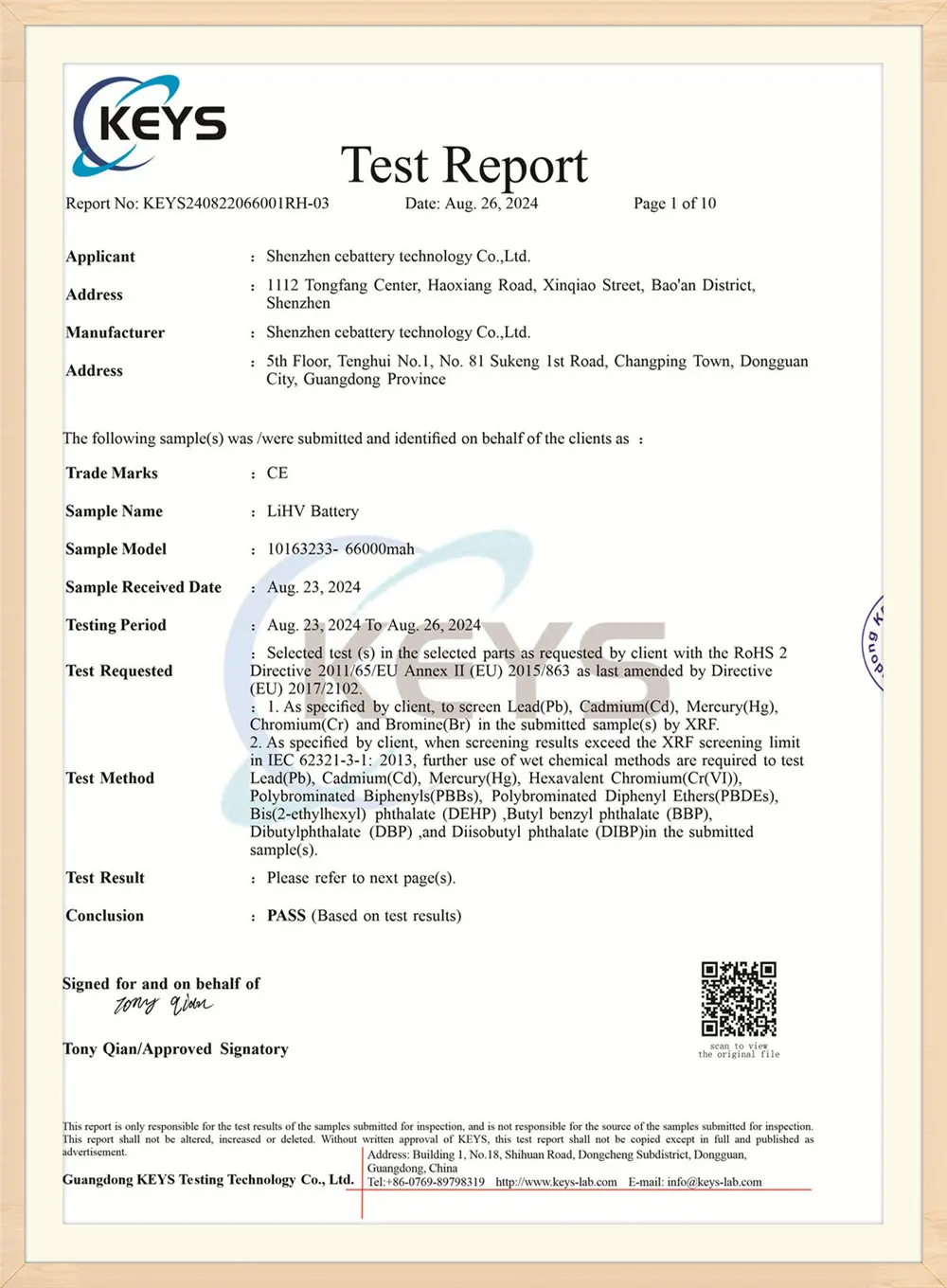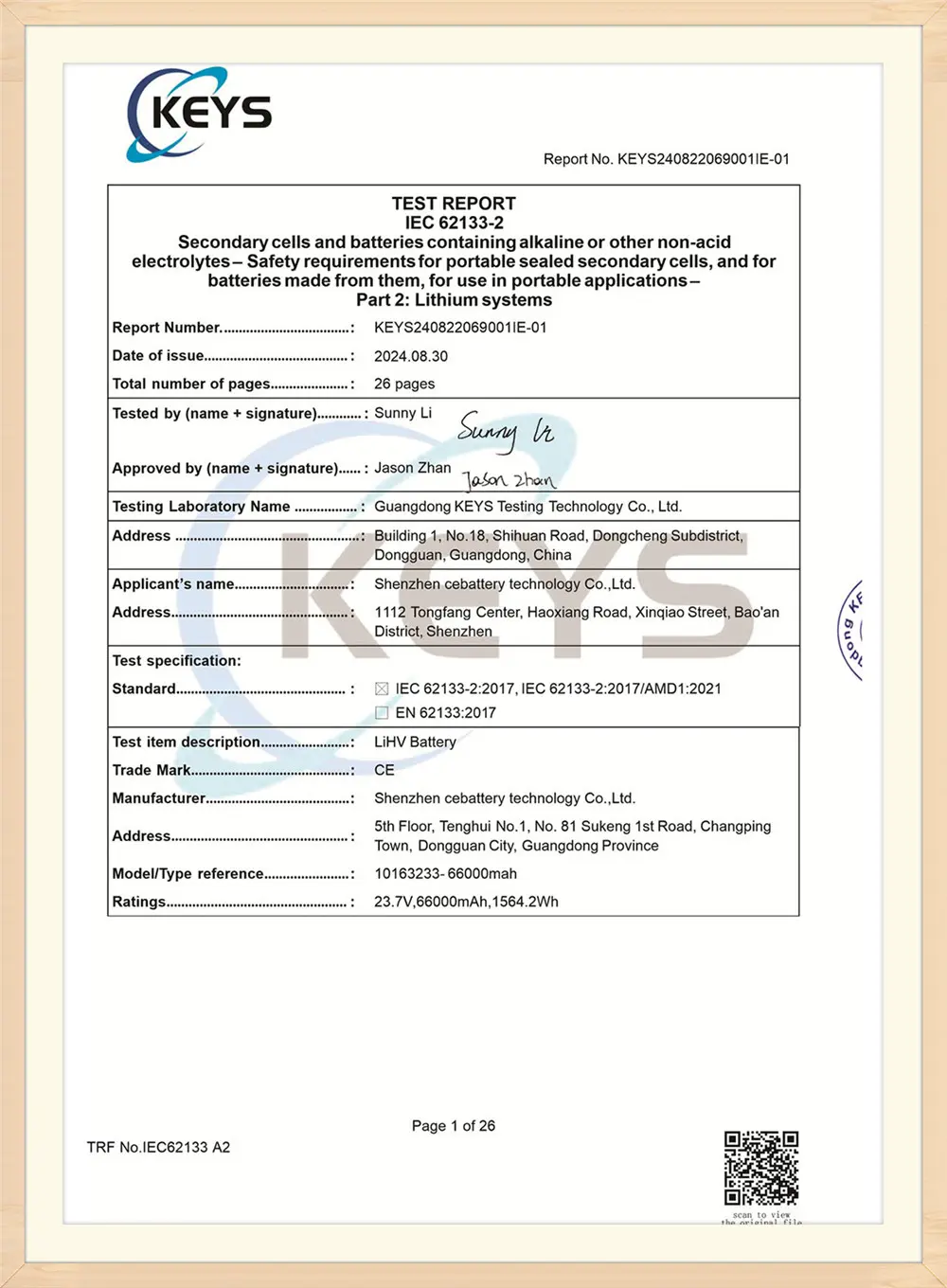 ZyebatteySemper persequitur negotium philosophia "qualis primus, ministerium orientatur, integritas observatio promissa". To be the best and most stable battery supplier, we provide high-quality rechargeable battery technology and ZYEbattey has passed many authority certifications, such as ISO9001:2015, UL, CE, FCC, UN, 3C etc.